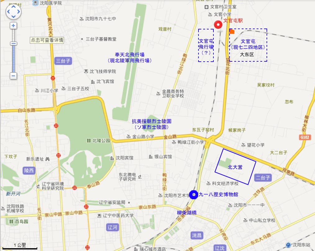 (文官屯周辺地図。満州事変発生地である九一八歴史博物館にも近い。)