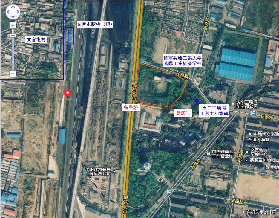鳥居で「遼寧兵器工業大学」の東西に2つある。(衛星地図を参照。)